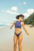 Inspired by the legendary Jaws surf spot, this metallic purple bikini top features a stylish criss-cross back and elastic underbust band for confident support. Made from luxurious Carvico Vita® recycled fabric with UV protection and a light-reflective metallic sheen. Ideal for movement, sun, and surf.